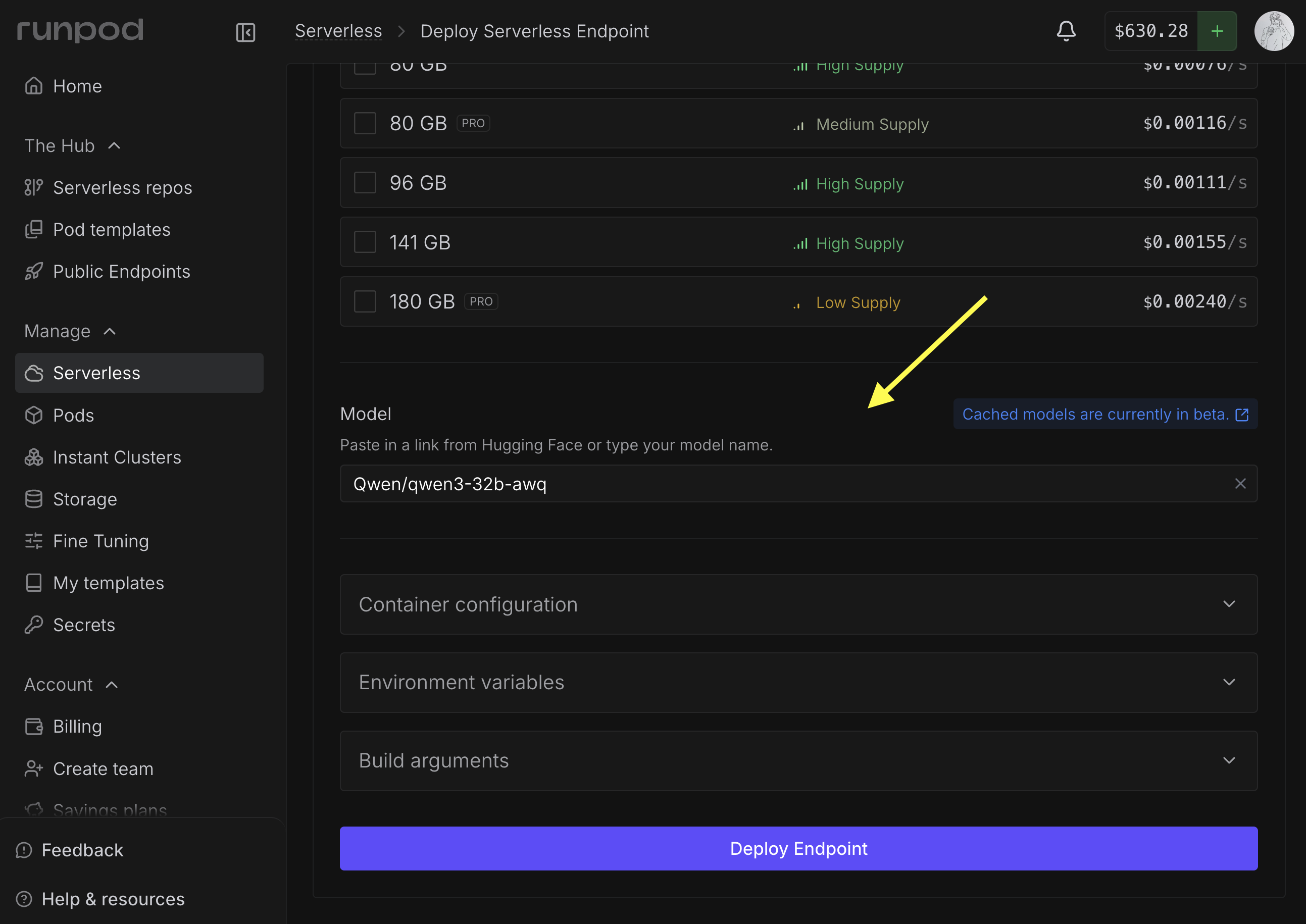 Follow these steps to select and add a cached model to your endpoint:Create a new endpoint